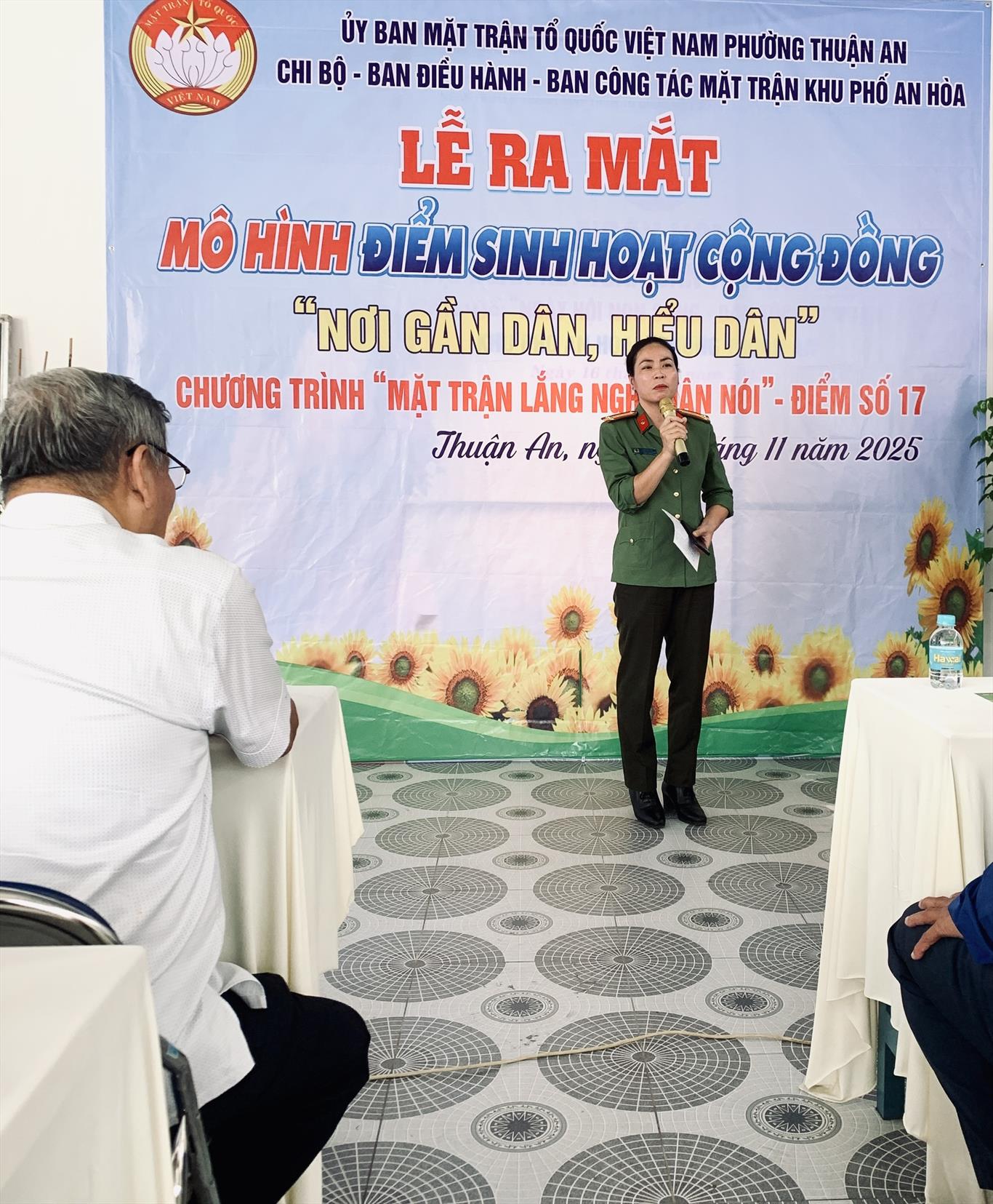 Đc Trần Thị Diễm Trinh TUV, bí thư đảng uỷ, chủ tịch HĐND phường trong phát biểu khai mạc và đón đoàn đã nêu rõ : Tất cả cán bộ đảng viên, công chức, viên chức phường Thuận An ngay từ sau ngày thành lập mới, đã quyết tâm để xây dựng một chính quyền thực sự gần dân, phục vụ cho người dân, doanh nghiệp và địa phương cùng phát triển. Tại khu phố là nơi sinh hoạt dân chủ của cư dân.
